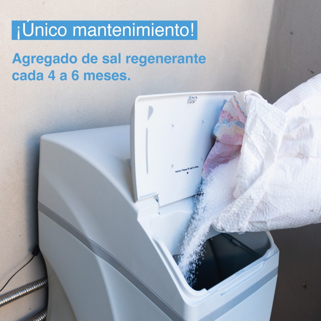 Optimización del fácil mantenimiento. Sólo requiere el agregado de sal regenerante en el tanque salero cada 6 meses en tiempo promedio. Consume menos sal por su eficiencia y funcionamiento inteligente.